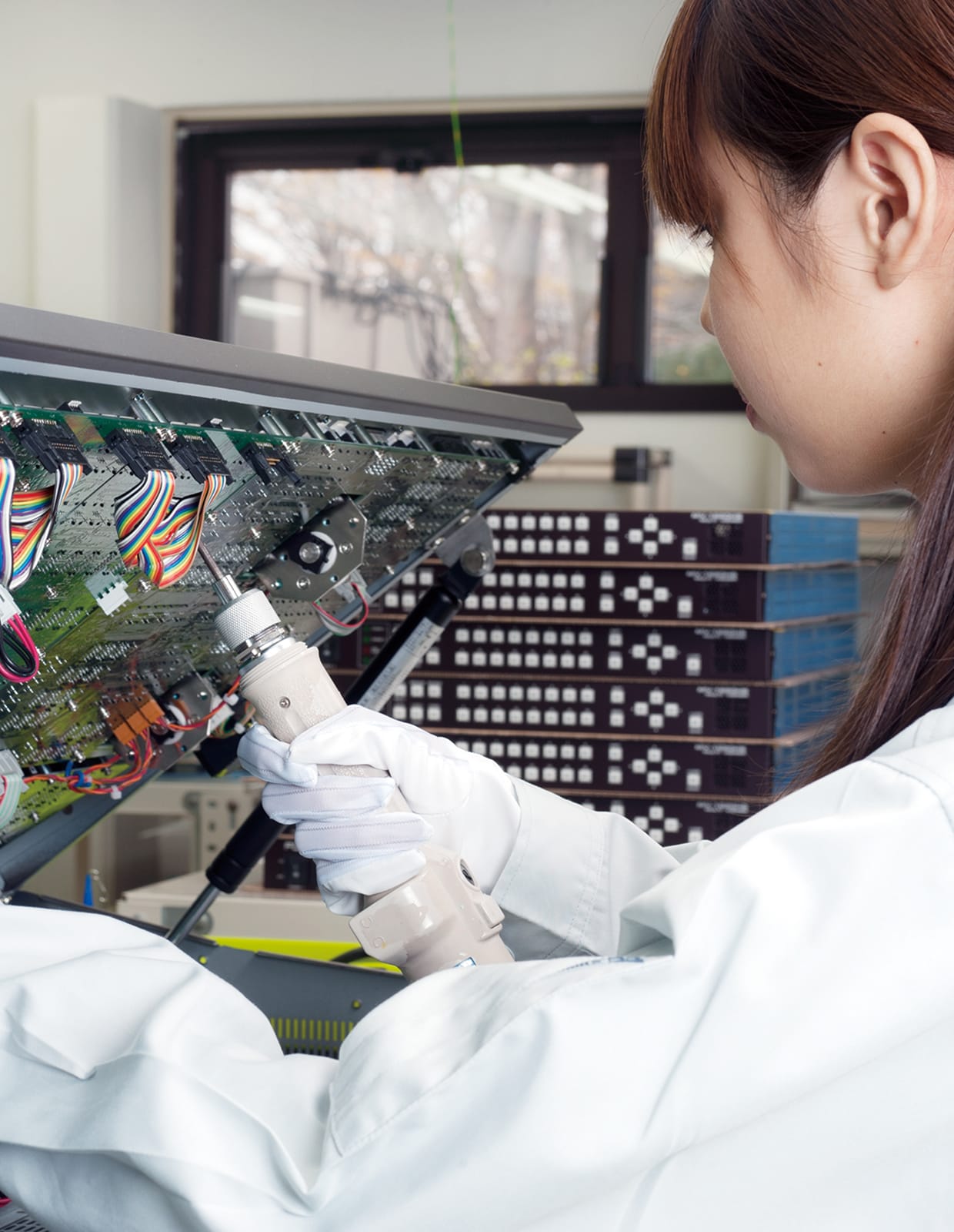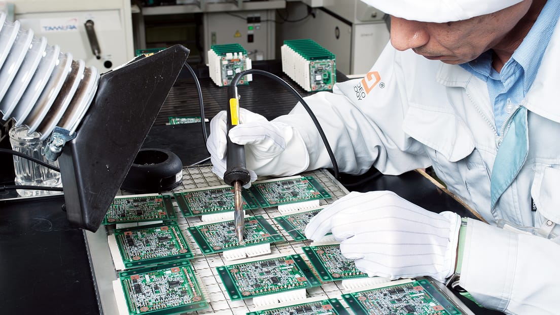 400種以上におよぶ朋栄の多彩な製品を一手に製造。熟練者によるセル生産で少量多品種製造に迅速に対応し、徹底した品質検査でお客様の信頼に応えます。また、最新の部品実装設備を導入。自社製品だけでなく製造受託にも応え得る、高い製造能力を誇ります。