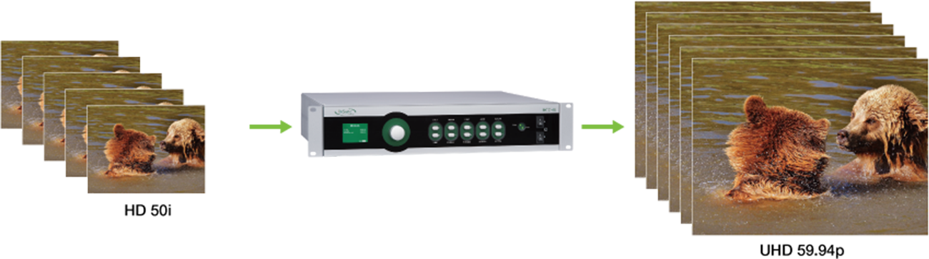 動き補正処理によるフレームレート変換を実装。3G/HDをUHDに変換し、12G/6Gおよびquad link 3G(2SIおよびSQD)で同時出力可能。3GおよびHDコンテンツのUHD制作での活用をサポート。