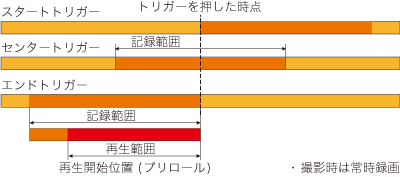 FT-ONEシリーズは、電源投入時から常に録画を行っています。必要なシーンを記録するため、高速撮影に必須のトリガー入力は、スタート、センター、エンドの3種類のトリガーを用意。撮影内容に合わせて、トリガー位置に応じた範囲をメモリに保存します。再生においても、再生開始位置から必要な個所を再生できるプリロール機能を搭載しています。