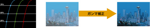 ガンマ調整はG,B,R各単独に調整可能。ガンマカーブは可変範囲の中心をハイトーン (75%付近) とミッドトーン (50%付近) とダークトーン (25%付近) から選択可能。シーンの明るさに応じた可変範囲を選択することで、効果的な結果を得ることができます。