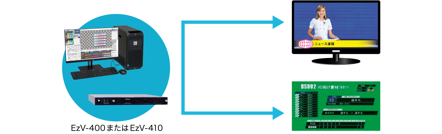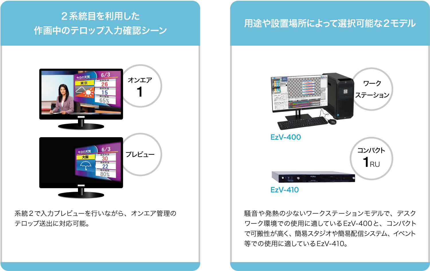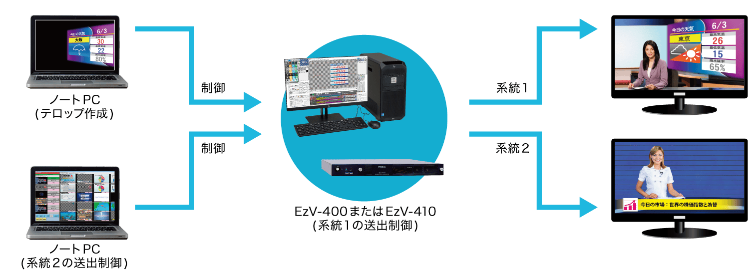 EzV-400またはEzV-410本体に加え、2台までのノートPCを使って、テロップ作成や2系統の番組送出制御を同時に操作可能。テロップ素材のインポートや送出順の並び替えなども可能。