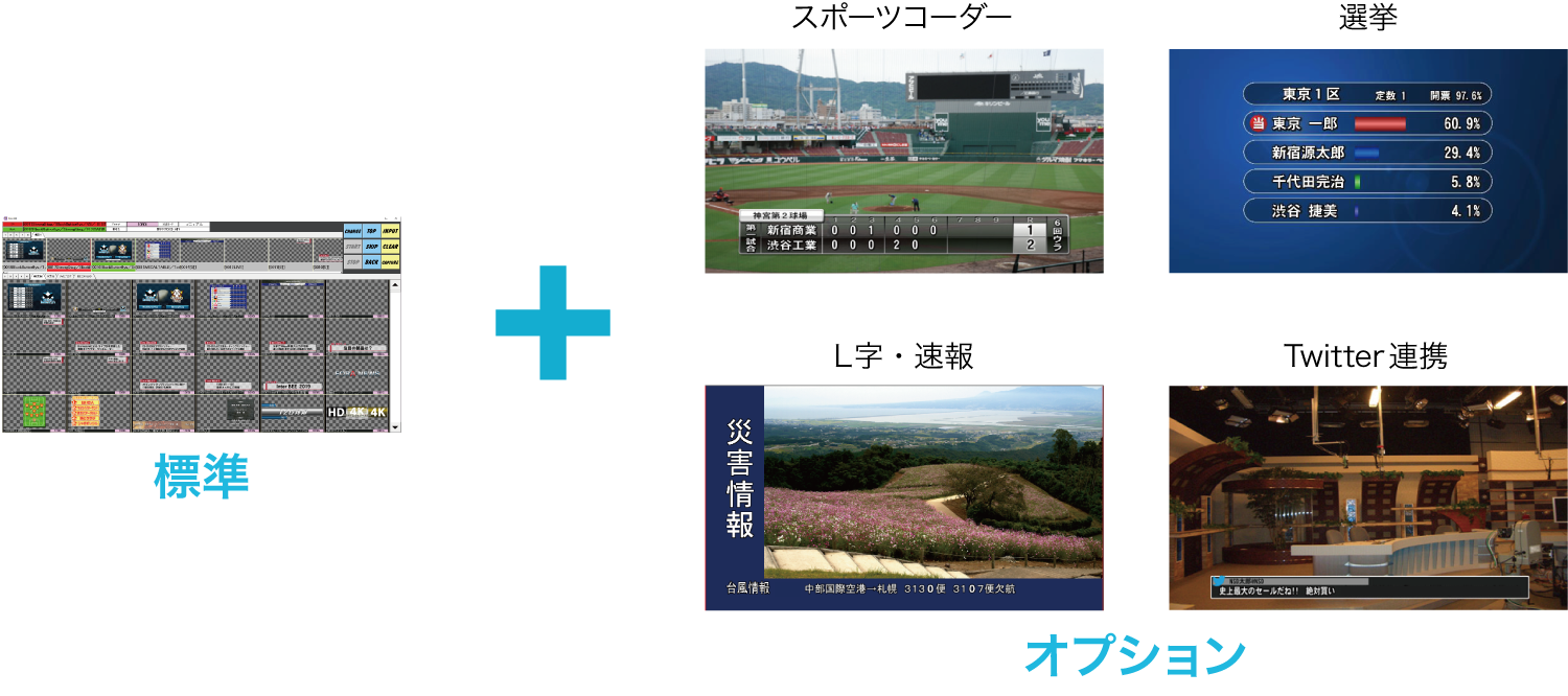 通常のテロップ送出のほかに、選挙、スポーツ、気象情報の送出 (L字送出、Twitter連動送出) など、様々な用途で活用可能なアプリケーション*を用意。