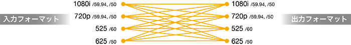 - アップ(SD → HD)/ダウン(HD → SD)/クロス(1080i ↔ 720p)コンバータ搭載