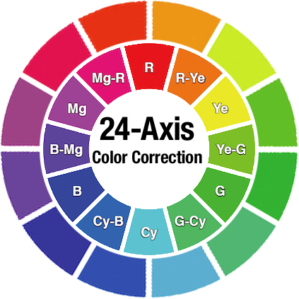 ビデオ出力部には、一般的なR/G/Bの3原色による色補正の枠を超えて24軸カラーコレクション機能を搭載。24軸それぞれで色相と彩度の調整が可能なため、ある特定の色だけを調整することができます。これまでは、RGB 3原色、CMY 3補色、それらの中間色6色をあわせた12軸色補正機能でしたが、この12軸の中間色12色を加えた24軸での補正を可能にし、中継現場シーンの色合わせや、異なるカメラで撮影した映像どうしの色味の調整を、より細かく調整できるようになりました。