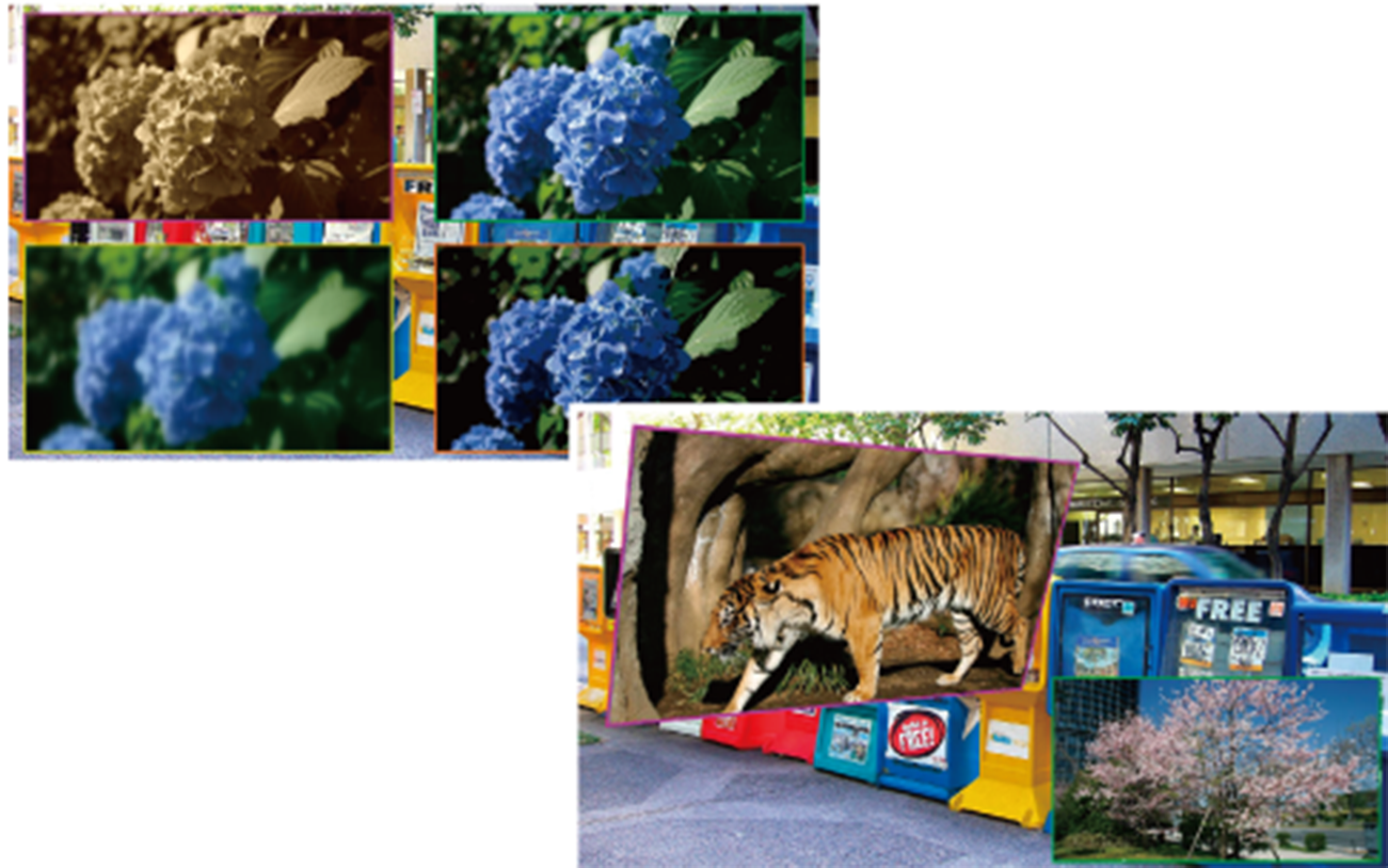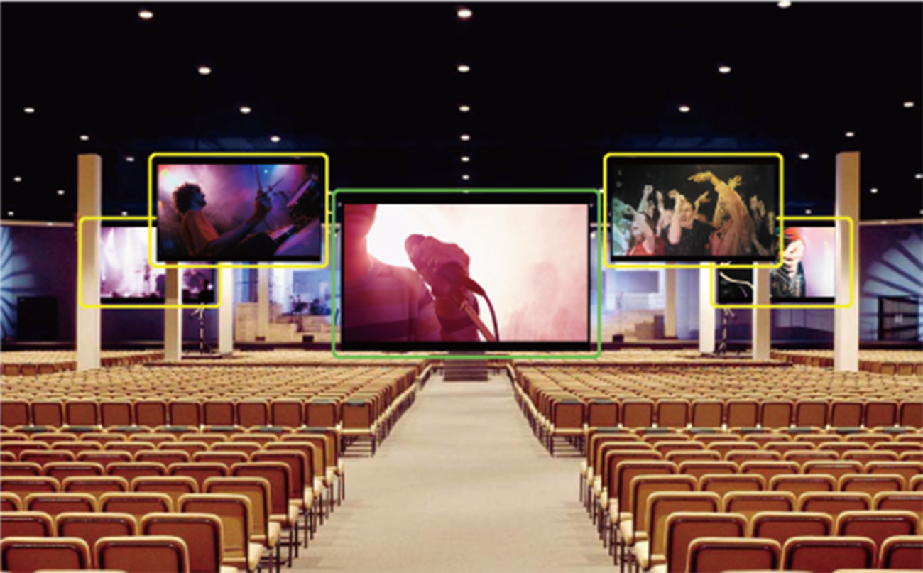 - FLEXaKEYを応用することにより、たった1台のHVS-490で、複数のモニターを並べたビデオウォール(マルチモニター)を実現可能。