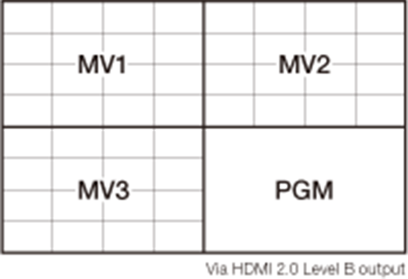HVS-490は標準で3系統のマルチビューワー(SDフォーマット時:2系統)を搭載し、それぞれ最大16分割まで(4K SQDモード時:最大4分割)表示可能です。系統ごとに39種類の分割パターンから1つを選択し、異なるマルチ映像を表示できます。メインのオペレーターに加え、別のオペレーター向けにも最適なモニタリング環境を提供します。また、HDMI 2.0 LEVEL B出力では4Kサイズの映像を出力できます。HDMI 2.0 LEVEL B出力時は4つの映像を1画面で確認可能です。
