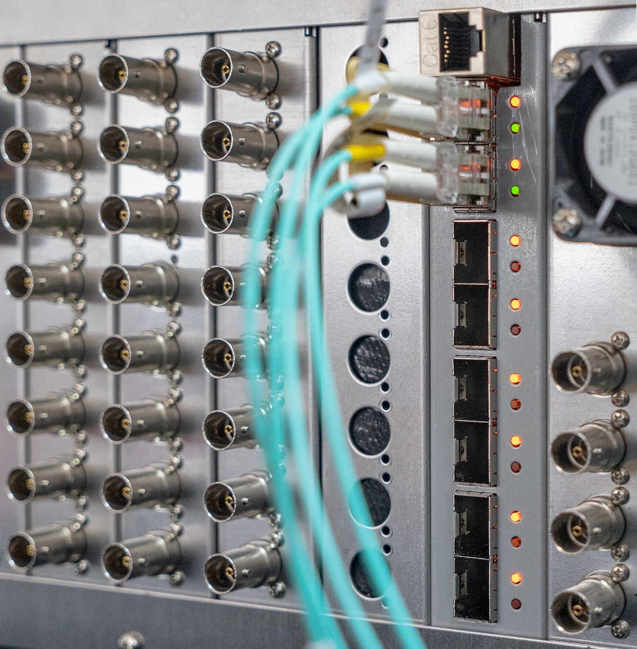 最大80入力に対応可能なため、8K映像を扱う場合にも十分な入力数を確保します。Video over IP 拡張カード HVS-6000IP-8IO*を使用することにより、SDI入出力とIP入出力の混在が可能。HVS-6000IP-8IO*は、カード1枚にSFP28(25GbE)8ポートを搭載し、8系統の4K非圧縮映像のIP入出力をサポート。