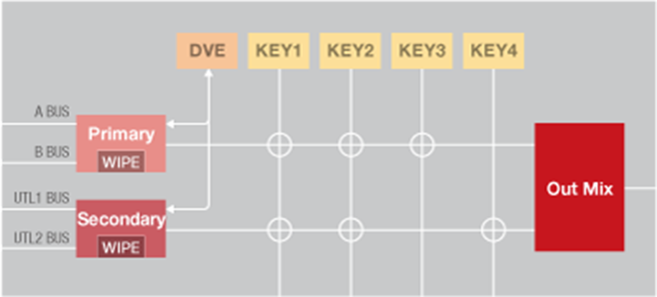 キーヤーはM/Eあたり4つ搭載。その全てが同一仕様でフル機能に加え、高画質な2D DVEを使用することが可能です。 BKGDには3D DVEを搭載し、HD同様の3D DVEトランジションが可能です。セカンダリーM/E機能は、HD/4Kどちらでも利用が可能です。
