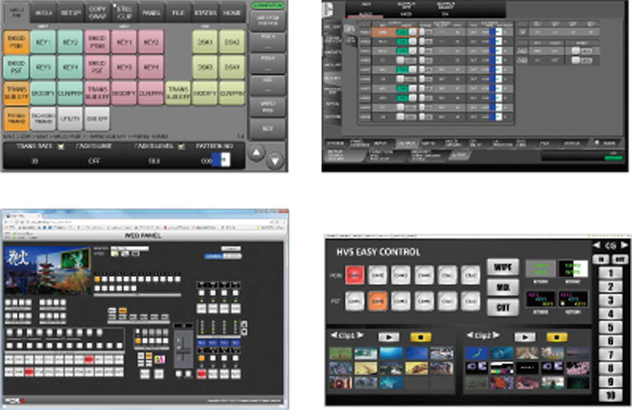 HVS-2000用のメインコントロールパネルを利用することができます。ラックサイズのHVS-2120ROU、2列タイプのHVS-2240OUA、3列タイプのHVS-3320OU、発注時にボタン数や列数、フェーダーの配置を変更することができるHVS-3355OUの4種類を用意しています。 ビデオ素材の種類やボタン機能別に点灯色を選べるRGBカラーボタンや、コントロールパネルに搭載したタッチパネルで操作可能なGUIメニュー、キー / マクロバスのマクロ名表示などで操作性を向上させることにより、正確な運用をサポートします。XYZの3軸を持つジョイスティック、つまみ、キーパッドによる直接入力も可能です。また、タッチパネル付き外部モニターを接続すれば、大型GUIを表示しながら操作することも可能です。ユーザーボタンは多彩な機能のフリーアサインが可能で、コントロールパネルの要所に配置しています。