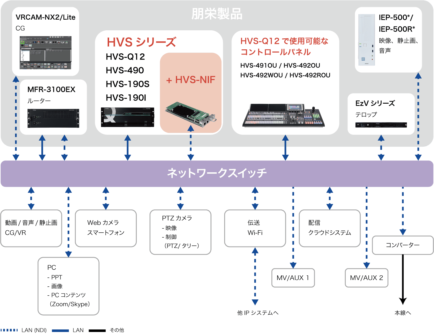 SDIシステムへのNDI出力対応機器/PCコンテンツの追加や、NDIシステムへの信頼性の高いベースバンド放送機器の追加が可能。