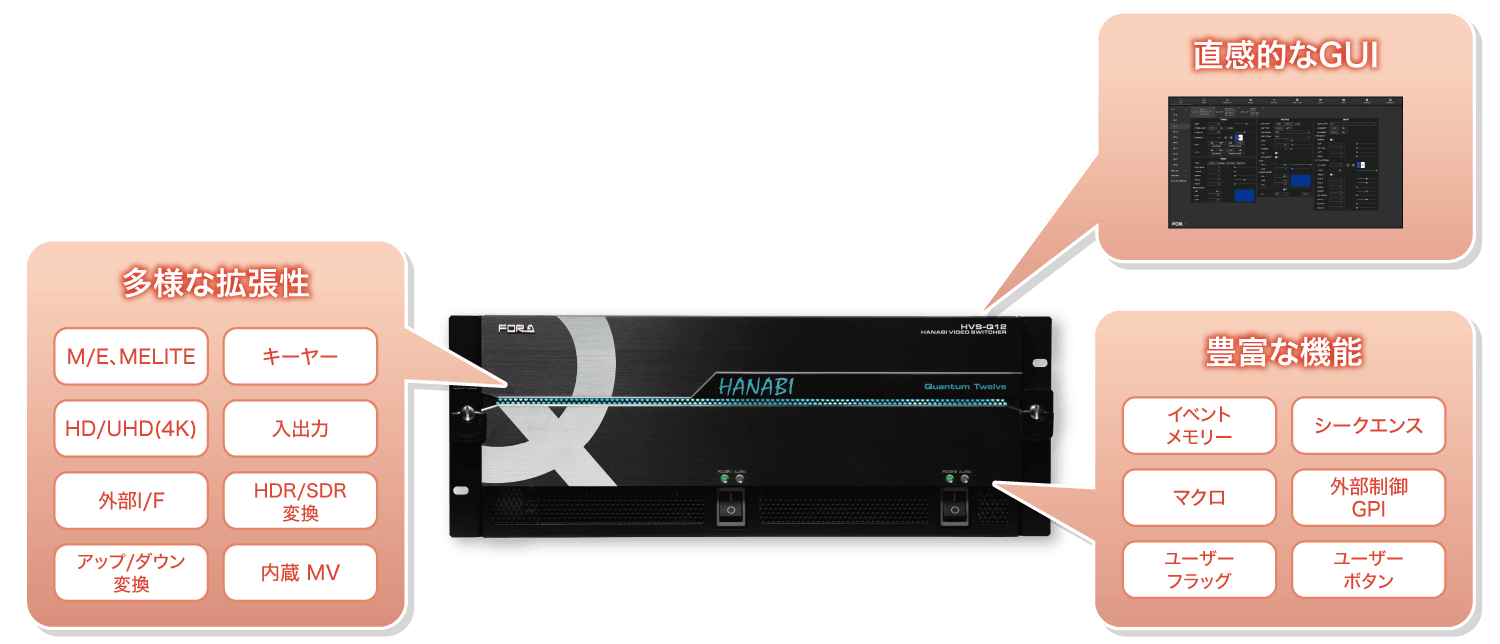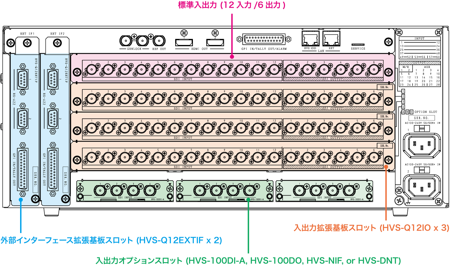 - 標準で3G/HD-SDI 12入力/6出力、HDMI 2出力が可能。オプションにより、4KやNDIにも対応