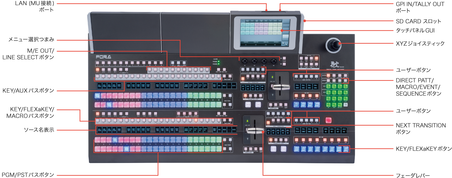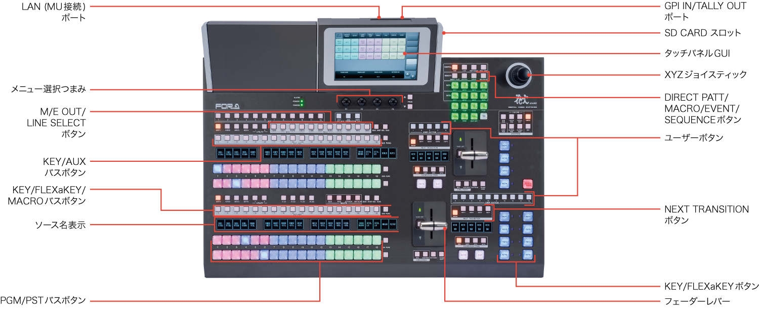 HVS-490用コントロールパネルはビデオ素材の種類やボタン機能別に点灯色を選べるRGBカラーボタンや素材表示用有機ELディスプレイ、コントロールパネル上に搭載した7インチのタッチパネルGUI、ソース名表示、マクロ名表示などで操作性を向上させることにより、正確な運用をサポート。各種設定はXYZの3軸を持つジョイスティック、つまみ、キーパッドによる直接入力も可能。また、ユーザーボタンは多彩な機能のフリーアサインが可能で、コントロールパネルの要所に配置。SDカード使用時には、設定ファイル、スチルデータのLOAD、SAVEが可能。