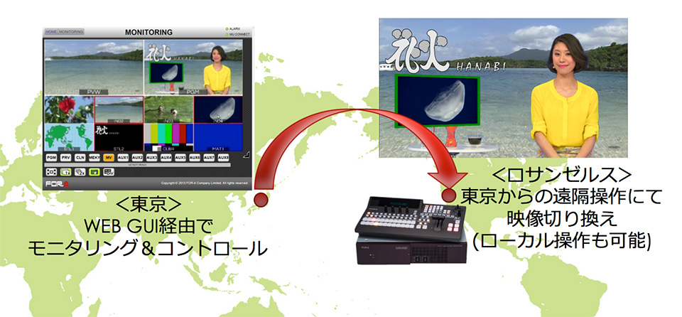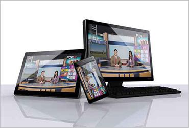 ひとつの番組をテレビ放送やワンセグ放送、インターネット放送などにマルチ配信する場合、画面の解像度にあわせて見やすいテロップを挿入する必要があります。HVS-100/110の持つアドバンスドAUX機能はPGMとは別のキー合成が可能なため、ワンセグ用、インターネット放送用には別のテロップを挿入するなど、マルチユースの現場でも有効に活用することができます。またWEBコントロールをはじめ、複数のパネルを接続することも可能なため、それぞれ別々のオペレーターが操作することも可能です。