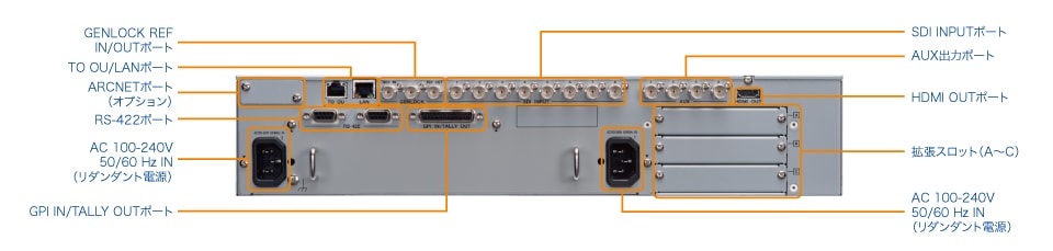 HVS-100には3つの拡張スロットを用意。HD/SD-SDI入出力の増設や、アナログコンポジット/コンポーネント、アナログRGB/HDMIといった各種入出力に対応した拡張カードを準備しています。必要な入出力を追加実装することで、外部にコンバーター等を用意せずとも現場の状況にあわせて柔軟性の高いシステムアップが可能です。