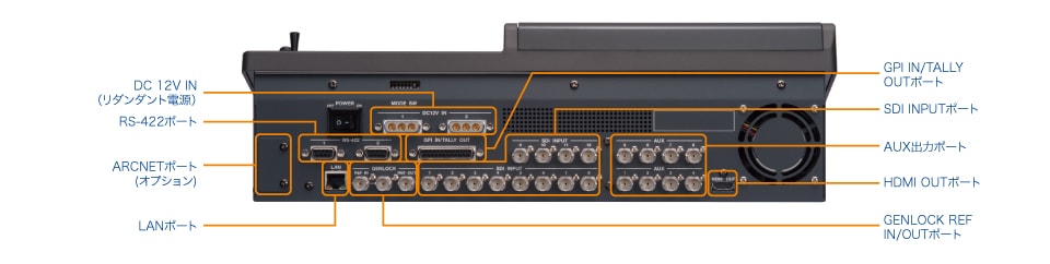 - 外部インターフェース:24入出力まで対応可能なGPIポート、編集機やHVS-30RUなどの接続に利用するRS-422ポート、PCコントロールの際に利用するEthernetポートを搭載