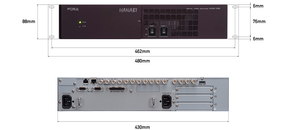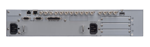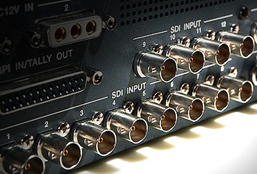 ビデオ入出力はHD/SD-SDIで12入力8出力を搭載。HD信号とSD信号の混在入力を標準でサポートします。9系統の出力はフリーアサイン可能で、内1系統にHDMIを搭載。入力された同期/非同期ビデオ信号のスイッチングを可能にするフレームシンクロナイザーを入力8系統に搭載。また、入力信号のビデオレベル、クロマレベルなどを調節可能なプロセスアンプ機能を全入力に搭載しています。