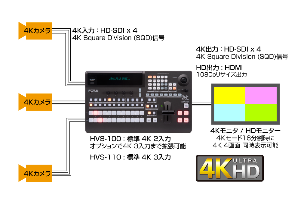来るべき4K制作時代を前にして、機器選択に頭を悩ませている方も少なくないのではないかと思います。いま導入すべき機材は何なのか?そうお悩みの場合はHVS-100/110をご選択ください。HDまたはSDでの運用を行いながら、将来的に4Kが必要になった際にはアップグレードにて対応が可能です。また、すでに4K制作システムを構築の場合でも、エマージェンシー用スイッチャーとして検討してみてはいかがでしょうか?HVS-100/110は、どんな場面においても最適なパフォーマンスをお届けすることをお約束します。