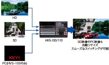 4系統のビデオ入力にリサイズ(拡大)エンジンを搭載。これによりアップコンバーターなどの外部機器を接続することなく、スイッチャ単体でSDとHDの完全な混在環境を実現します。SD信号はもちろん、PC映像のリサイズにも対応しています。