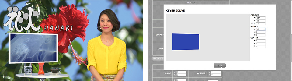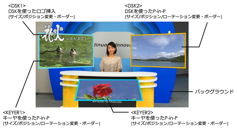 HVS-100、HVS-110には2つのキーヤー、2つのDSKを標準搭載しています。キーヤー、DSKを使ったロゴ表示はもちろん、標準のDVE機能を使ってピクチャー・イン・ピクチャー等の演出も簡単。拡大、縮小だけでなく、X、Y、Z軸を使ったパース表現も可能なため、角度のついたピクチャー・イン・ピクチャーも簡単に実現できます。それぞれにボーダー幅、ボーダー色の設定も可能です。