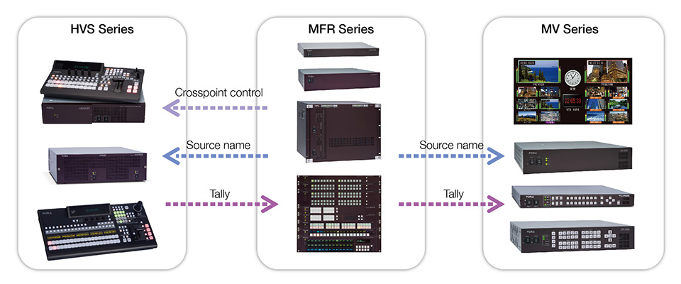 HVS-100、HVS-110は制御規格として業界で一般的なTSLプロトコルに対応しています。ルーティングスイッチャーMFRシリーズ、マルチビューワーMVシリーズとの連携により、クロスポイント制御、ソース名の連動、タリーの連動も簡単に実現できます。