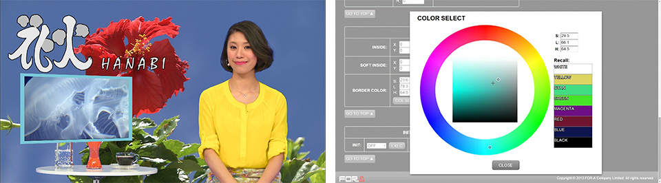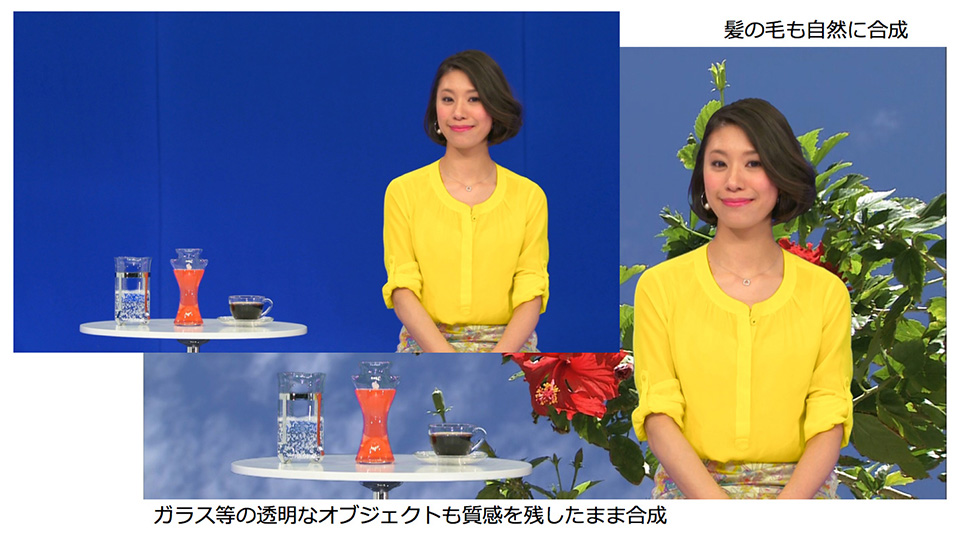 HVS-100、HVS-110には高品位クロマキーを標準搭載。指定色をカーソルで選ぶだけで綺麗なクロマキー合成を実現します。もちろん、パラメーターの追い込みにより、さらに精度を上げた合成が可能です。クロマキー合成の重要なポイントとなる髪の毛の表現はもちろん、ガラスや煙など、クロマキー処理が難しいオブジェクトも、質感を残したまま自然に合成できます。