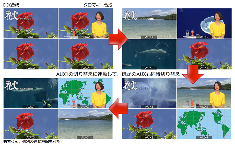 アドバンスドAUX機能により、AUX出力へのキー合成、ディゾルブ機能により、PGMとは別のテロップをAUXに挿入したり、映像をフェードで切り替えたりと、演出面でも大いに活用いただけます。また、特定のAUXに連動してその他のAUX出力を自動的に切り替える連動切り替え機能も搭載。これにより、複数のAUX出力を活用した演出でもワンマンオペレートで高度な演出を実現します。