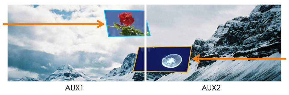 AUXにDSKをアサインできる特徴を活用し、マルチディスプレイ環境を簡単に構築できます。同時切り替え、ディゾルブ、ワイプ効果も可能です。2画面でのマルチディスプレイを構築し、ピクチャー・イン・ピクチャーがふたつの画面を行き交うようなアニメーションも演出可能です。