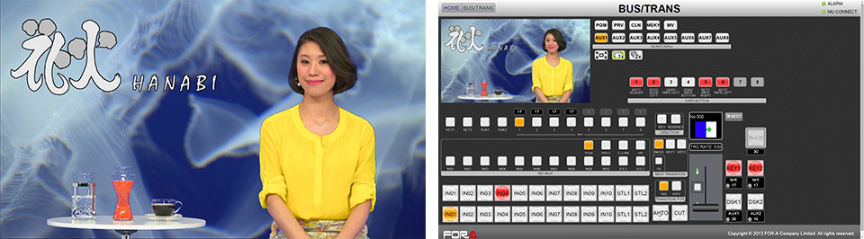 InfinitySet(Brainstorm社製アドバンストバーチャルシステム)をインストールした PC とHVS-100/110 を連動させ、コントロールパネルから InfinitySet の映像の切り換えを可能にします。