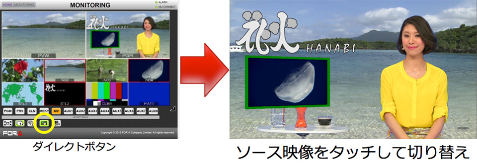 HVS-100/110のAUX出力はモニタリング用途だけに利用するものではありません。PGMだけでなく、AUX出力に対してもDSKのアサインが可能です。また、キーをスーパーしたままバックの映像をディソルブすることが可能です。AUXの概念を超えたアドバンスドAUXにより、複数のビデオスイッチャーを使わなければ実現できなかったマルチモニター演出をHVS-100/110 1台で実現します。