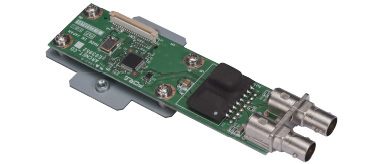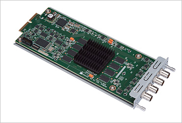 カード1枚で4系統のHD/SD-SDI増設が可能です。全入力にフレームシンクロナイザー機能、うち2系統にリサイズ(拡大)機能を搭載、SD映像もHD映像として内部処理可能です。3G-SDI信号で入力する場合は、Level-A/Level-Bのどちらの信号入力にも対応します(Level-B信号は自動的にLevel-A信号に変換します)。