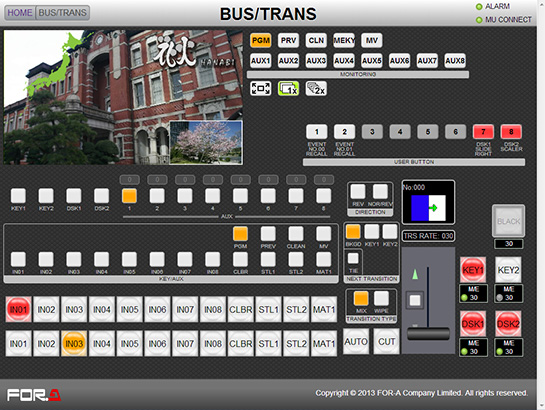 HVS-100、HVS-110にはWEBブラウザー経由でのコントロール機能が標準で搭載されています。実際のコントロールパネルを模したGUIではバスボタンやキーヤーボタン、AUTOテイクボタン等も実機さながらに操作できます。モニタリング画面では、マルチビューワー出力を映像として確認することもできます。DVEのパラメーター設定やキーボーダーの色調整もGUIにてわかりやすく直感的に操作できます。