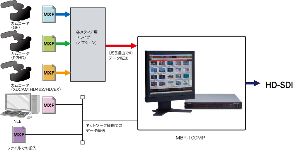 - カムコーダ等で収録したメディアを各社ドライブ経由でMBP-100MP に転送、HD-SDI のベースバンド信号にて出力