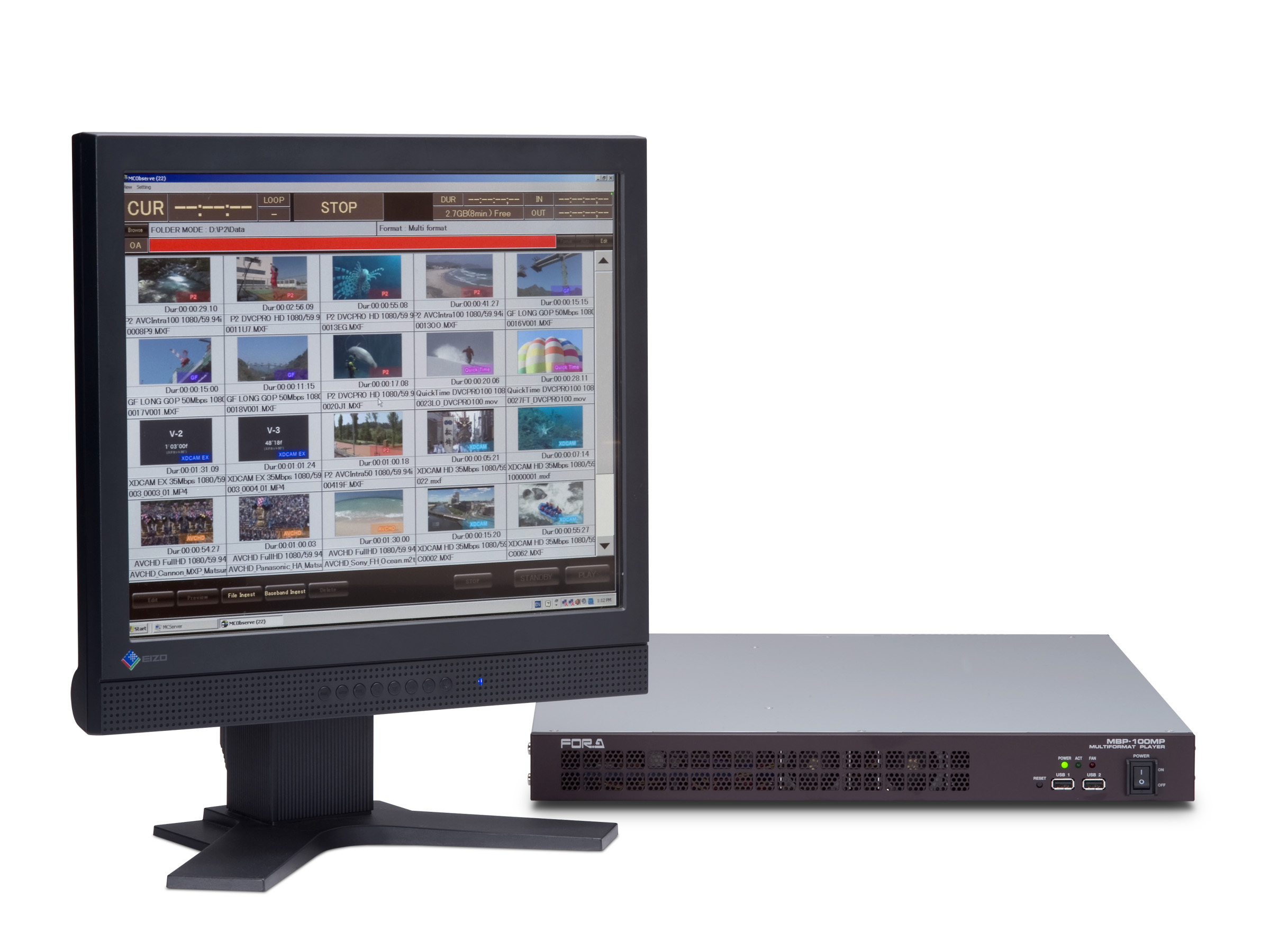 - ノンリニアで編集/作成されたファイルをネットワーク経由でMBP-100MP に転送、HD-SDI のベースバンド信号にて出力