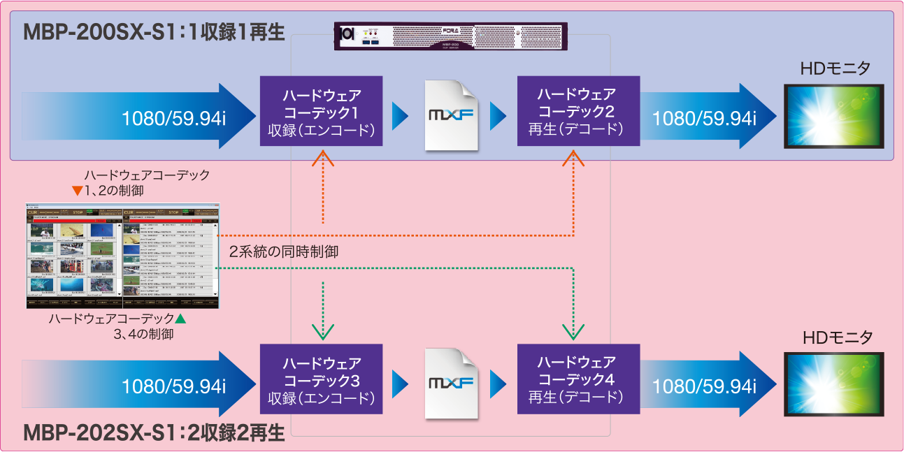 - MBP-202SX-S1の場合。MBP-200SX-S1は1系統の同時収録・同時追いかけ再生となります。