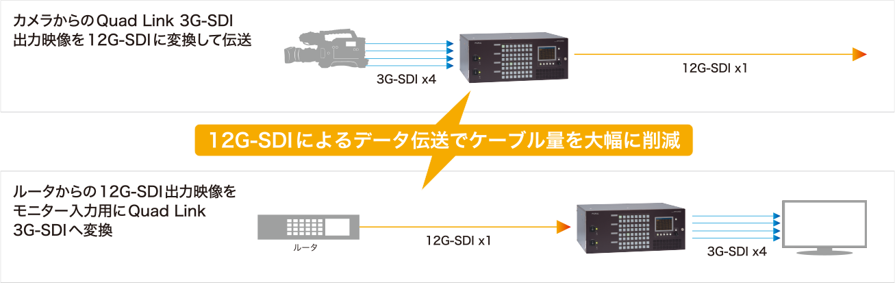 オプションのMFR-8SDIGB、MFR-8SDOGBを追加することにより、12G-SDIとquad link 3G-SDIの相互変換、2SIとSQD のマッピング相互変換が可能です。従来の12G-SDI非対応機器も使いながら、12G-SDIを中心としたシステム構築が可能になります。
