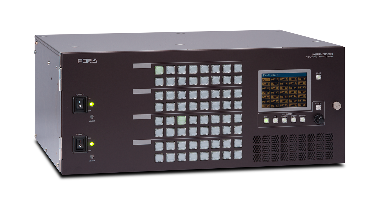MFR-8000/5000などの大型ルータから安全管理のコンセプトを継承し、冗長性とメンテナンス性を高めたルーティングスイッチャ。8チャネル単位でモジュールを増設可能で、最大で64 x 64のマトリクスを構築。SDI以外のモジュールを混在して組み込むことも可能です。放送システムにはもちろん、病院内の手術室および会議室、研修室などのさまざまな信号が発生するシステム環境や、入出力数および信号フォーマットの変更が必要となる中規模サイズのシステムに最適な製品です。