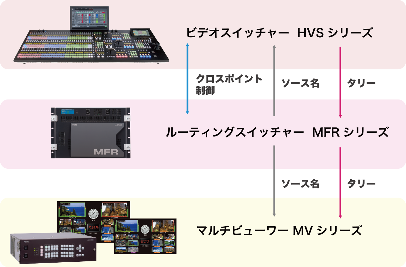 - ビデオスイッチャーHVSシリーズからルーティングスイッチャーMFRシリーズのクロスポイントを制御
