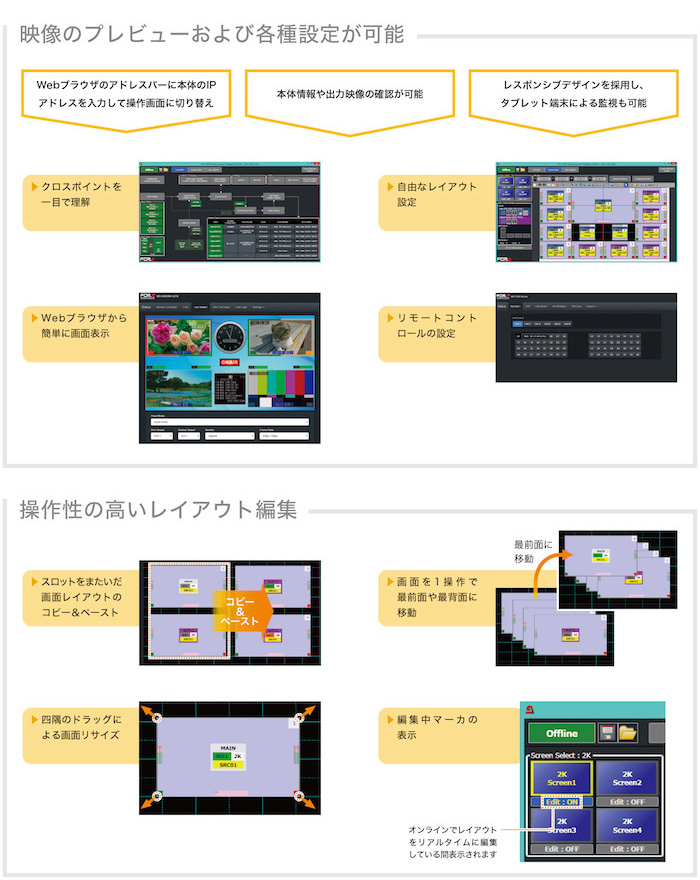 Windows PC上で動作するレイアウトマネージャを標準添付。レイアウトパターンの登録や切り替え、タイトル表示など各種設定をPC上から自在に変更可能です。レイアウトは4K/2Kモード出力ごとに、それぞれ16パターンまで本体メモリに保存可能。保存後はフロントパネルからダイレクトにリコールできます