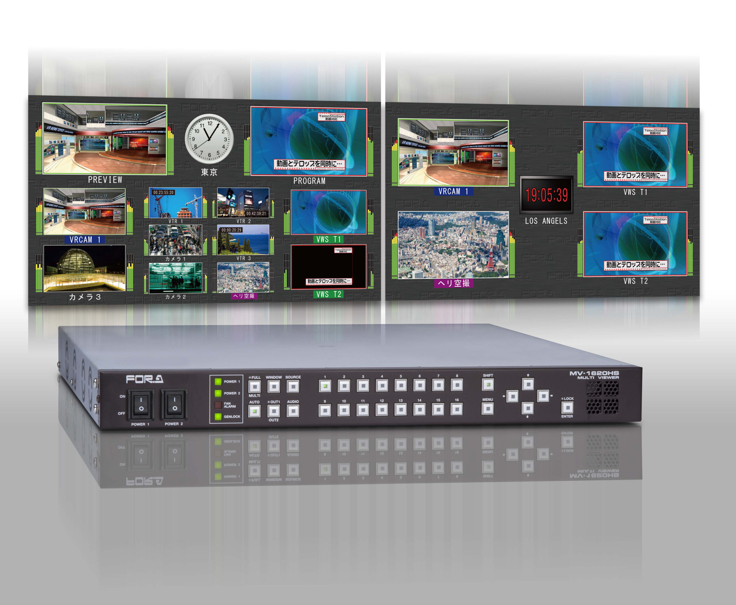 MV-1620HS は、HD-SDI、SD-SDI、アナログコンポジット信号の混在入力に対応したマルチビューワです。1Uのコンパクトなフレームで最大16入力2出力のモニタリングが可能。自在なレイアウト、オーディオレベル表示、タイトル表示、タイマ表示など、多彩な機能を搭載し、かつ低価格化を実現しています。