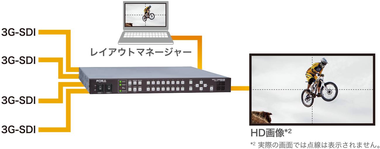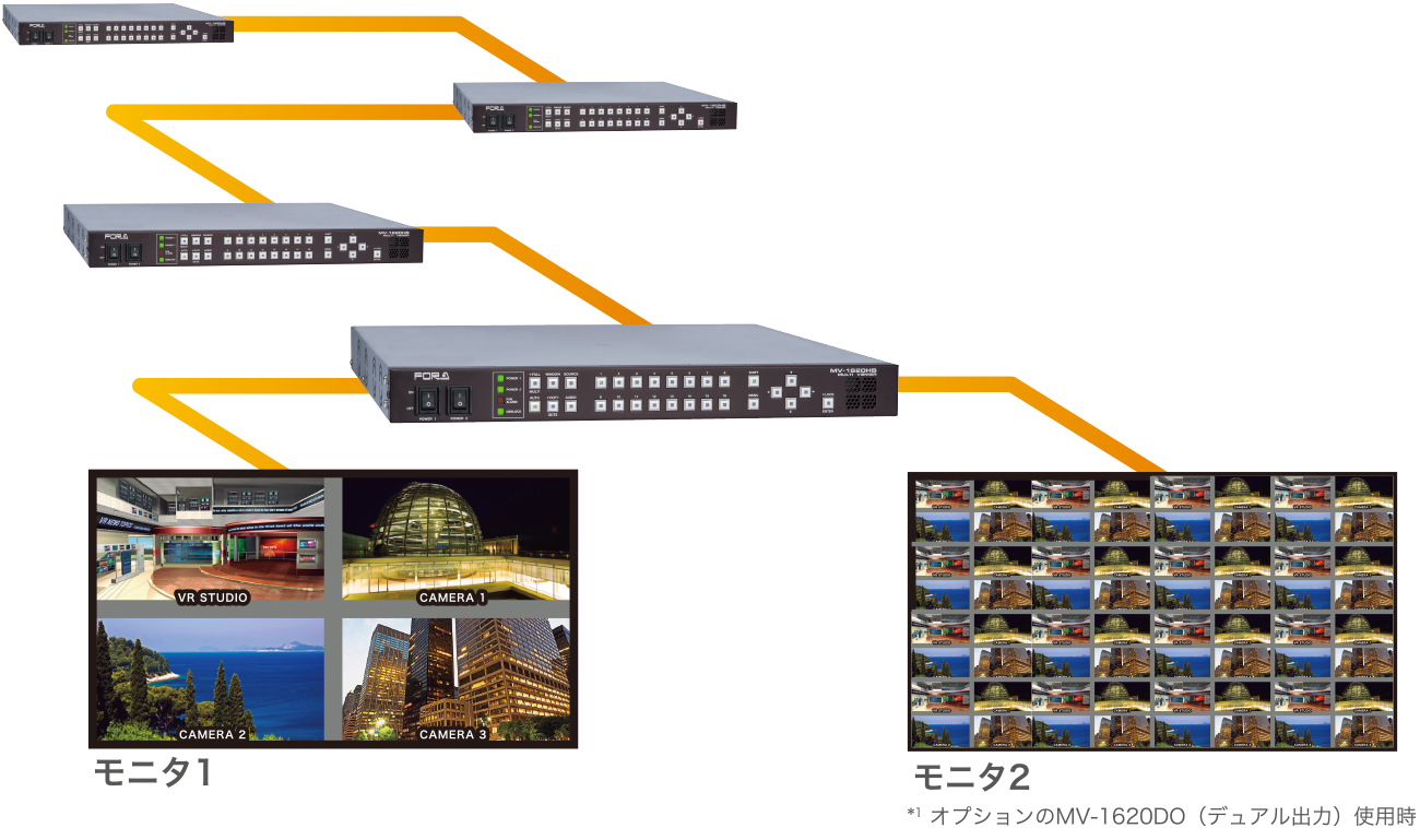 4台をカスケード接続することで、最大4 x 16 = 64分割のビデオウィンドウを表示。同期信号に対する遅延の心配もいりません。