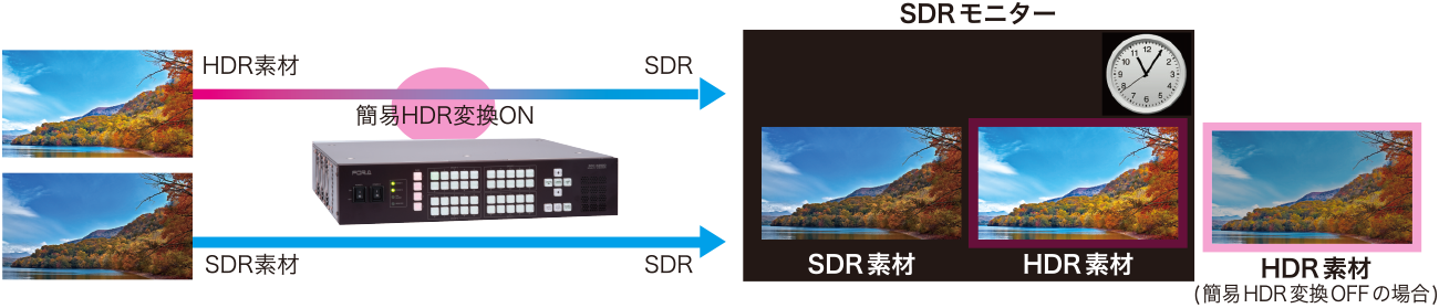 HDR(HLG方式)*映像やSDR映像が混在するシステムの場合、HDR/SDR簡易変換機能を用いることにより、モニターの種類に関わらず、本来の輝度や彩度に近い状態での簡易モニタリングが可能です。入力毎に簡易変換ができます。