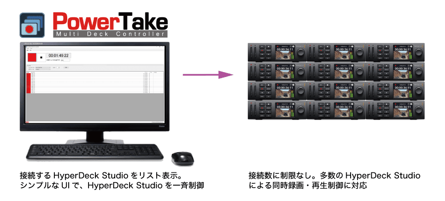PowerTakeシリーズは、Blackmagic HyperDeck Studioを複数台コントロールできる、Windows向けアプリケーションソフトウェアです。