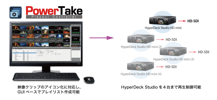 HyperDeck Studio内の映像クリップをサムネイルアイコン化し、直感的なGUIで再生順序を指定・再生操作できるPowerTake Playout Controllerと、接続台数の制限なく一括で録画・再生コントロールできるPowerTake MultiDeck Controllerの2種類のソフトウェアを用意。