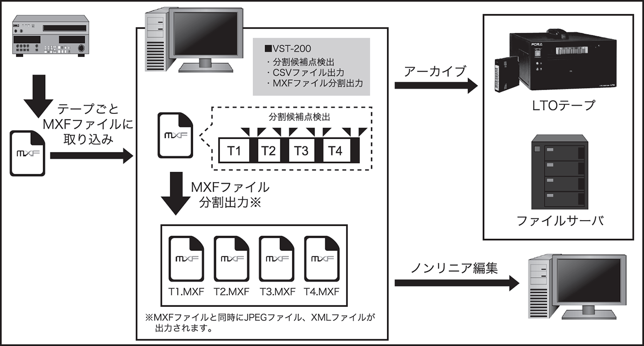 VST-200は、テープ資産のファイル化で発生する煩雑なVTR操作を省き、シンプルなワークフローを実現する過去資産のアーカイブ業務に最適なアプリケーションです。テープ全体をファイル化したMXFから、サムネイル・メタXML・分割情報ファイルを出力します。分割情報毎にMXFファイルの分割処理も可能です。