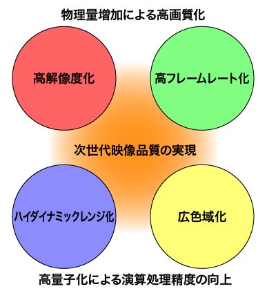 次世代放送への取り組みとは別に、映画コンテンツへの応用や、CG(Computer Graphics)や、VR(Virtual Reality)、AR(Augumented Reality)、MR(Mixed Reality)などを活用した医療、セキュリティ、教育などの分野で、新たな映像表現への取り組みが加速してきています。今回の次世代映像への移行は、SDからHDへ解像度が移行した時期とは異なり、(1) 解像度、(2) フレームレート、(3) 色域、(4) ダイナミックレンジという各要素の標準規格が移行することも特徴です。「より自然な、見た目に近い映像表現が可能になる」と簡単に表現されていますが、実はこれらの要素をしっかりバランスさせて表現していくことが不可欠になっていきます。